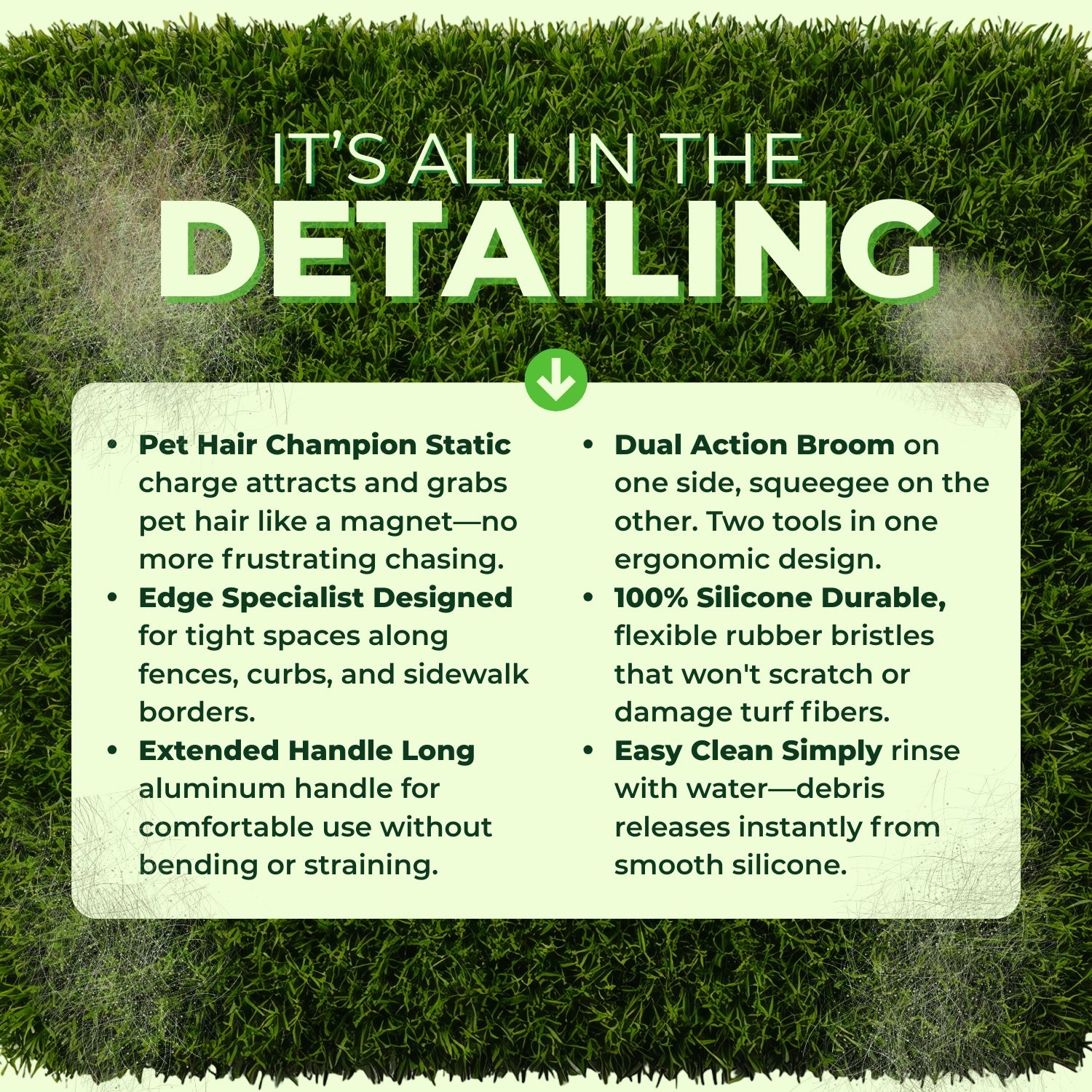 Unlike standard bristle brooms, the Turf Static Sweep uses high-friction silicone bristles that create a natural static-like grip, allowing it to lift embedded pet hair and fine debris out of artificial turf fibers without damaging the turf or scattering debris into the air. This makes it an ideal detail broom for artificial grass maintenance, dog runs, residential lawns, commercial turf areas, and pet facilities.